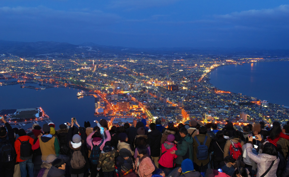 在北海道的函馆山看到的夜景被选为「日本三大夜景」。 根据四季的变更在白天可以欣赏到不同的风景。 在夜晚看到被海峡包围着的城市的灿烂灯火。